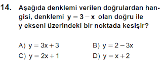 ![]() | Çözüm: y = 3 - x doğrusu ile diğer doğru y ekseninde kesişiyorsa x = 0 olmalı y = 3 - 0 ve y = 3 A) y = 3.0 + 3 -> y = 3 B) y = 2 - 3.0 -> y = 2 C) y = 2.0 + 1 -> y = 1 D) y = 0 + 2 -> y = 2 Cevap A |